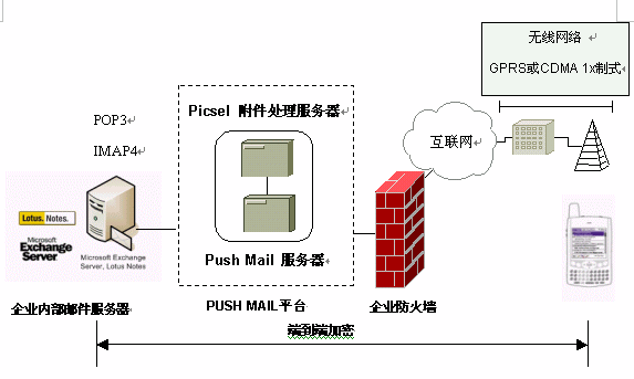 企業(yè)在其內(nèi)部放火墻內(nèi)安裝PUSH MAIL平臺,并在移動終端上安裝相應(yīng)的PUSH MAIL客戶端軟件,可以將企業(yè)郵箱用戶現(xiàn)有的EMAIL帳號延伸到手機上,不改變用戶的使用習(xí)慣,可以瀏覽郵件的附件。采用端到端的加密措施,確保郵件的安全性。