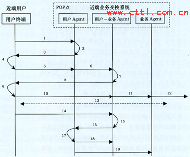 在POP點(diǎn)處,每類業(yè)務(wù)有一個(gè)“業(yè)務(wù)Agent”,其生命周期與運(yùn)營商此類業(yè)務(wù)的生命周期相同,即從運(yùn)營商開通此類業(yè)務(wù)到運(yùn)營商終止提供此類業(yè)務(wù)為止,因此“業(yè)務(wù)Agent”基本上是長期存在的。“業(yè)務(wù)Agent”負(fù)責(zé)對(duì)不同用戶的同類業(yè)務(wù)進(jìn)行匯聚,統(tǒng)一與遠(yuǎn)端的“業(yè)務(wù)Agent”進(jìn)行業(yè)務(wù)交互。