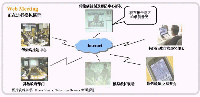 在韓國已經(jīng)安排多次的模擬演示,當(dāng)疫情在韓國發(fā)生及蔓延時,由韓國傳染病控制及預(yù)防中心發(fā)出開會通知,召集其他緊急醫(yī)療機(jī)構(gòu)、專家及政府部門(如行政自治部)等,一起進(jìn)行視像會議。在會議上,傳染病控制中心將各地收集回來的最新情況及報表共享給參會人及團(tuán)體。由各專家一起分析現(xiàn)況,進(jìn)行討論、判斷及決定解決辦法及措施。同時要求其他政府部門協(xié)調(diào)與全力幫助,目的是將疫情在最短的時間及在最少的范圍內(nèi)得到控制及處理,減少對人民生命安全及國家損失的影響。先進(jìn)的通訊科技能加快對危機(jī)發(fā)生時,政府相關(guān)部門及機(jī)構(gòu)對事件的了解、分析、處理及決策,準(zhǔn)確傳達(dá)信息、加強(qiáng)信息的交流、提高辦事效率、加快決策速度以及落實措施及處理方法的執(zhí)行。最重要的事,將各方面的損失降到最低的程度,避免了事情的惡化及波及其他范圍的負(fù)面影響。