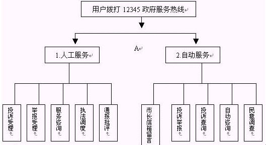 當(dāng)用戶撥通"12345"電話并選擇自動(dòng)服務(wù)時(shí),聲訊臺(tái)自動(dòng)播放引導(dǎo)語(yǔ)"選擇市長(zhǎng)信箱留言請(qǐng)按1,自動(dòng)投訴舉報(bào)請(qǐng)按2,投訴查詢請(qǐng)按3,服務(wù)咨詢請(qǐng)按4,民意調(diào)查請(qǐng)按5。