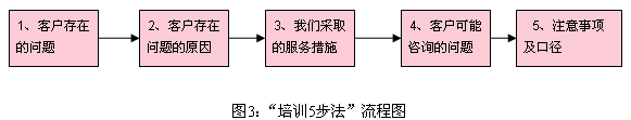 我們要求所有培訓(xùn)課件都按“客戶存在的問(wèn)題→客戶存在問(wèn)題的原因→我們采取的服務(wù)措施→客戶可能咨詢的問(wèn)題→注意事項(xiàng)及口徑”這五步進(jìn)行編纂。各步驟含義說(shuō)明如下: