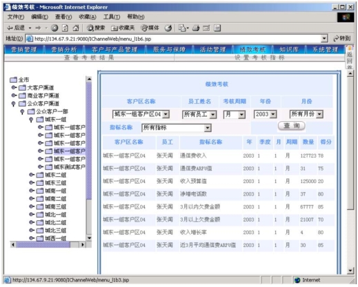 作為電信營銷服務支撐系統(tǒng),其主要功能是支撐營銷人員開展營銷活動,并通過功能完善的考核系統(tǒng)幫助各級人員進行工作管理。本系統(tǒng)可以對KPI指標進行靈活的設定,可以靈活定義多種參與考核的數(shù)據(jù)來源,使得各級主管能夠對客戶組、社區(qū)(商業(yè)客戶區(qū)、農(nóng)村統(tǒng)包區(qū))的營銷服務工作進行考核評分?己酥芷诳梢酝ㄟ^參數(shù)進行設定(一般以月為單位)。