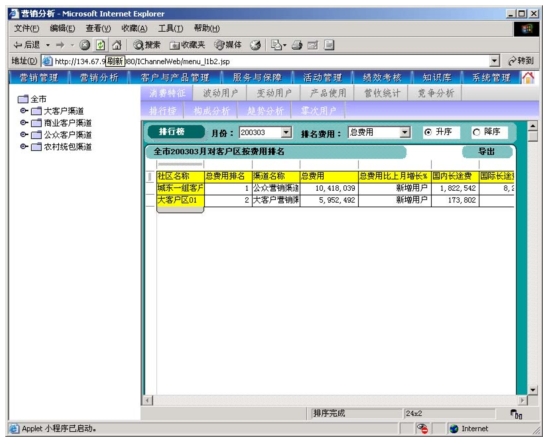 本系統(tǒng)是以市場為導向、客戶為中心、效益為目標的電信營銷和服務的支撐系統(tǒng),為企業(yè)經(jīng)營服務和營銷戰(zhàn)略提供有力的支撐,通過對業(yè)務收入、業(yè)務發(fā)展以及市場競爭的深入分析,從而達到留住老客戶、發(fā)現(xiàn)新客戶,了解競爭對手動態(tài),及時掌握市場變化趨勢的目的。