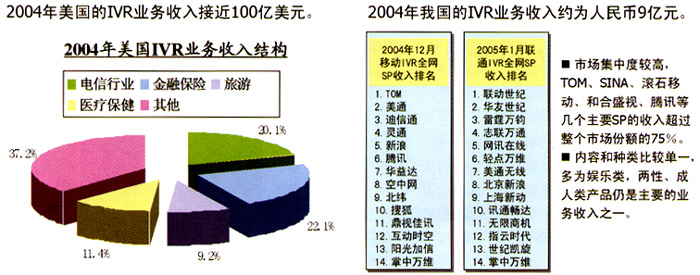 目前,國內(nèi)IVR的業(yè)務(wù)主要集中于為個人提供服務(wù)上,行業(yè)應(yīng)用所占比例較小,與成熟的國外市場以行業(yè)應(yīng)用為主的現(xiàn)狀形成巨大反差。而且,在為個人提供的語音業(yè)務(wù)中,國內(nèi)最受歡迎的仍是娛樂信息類中的聊天交友類業(yè)務(wù),這表明國內(nèi)個人用戶的需求層次較低;其次是娛樂和點(diǎn)播類的音樂類業(yè)務(wù);第三大類是游戲答題類,例如:知識競猜、有獎競猜、角色扮演游戲、互動游戲等;另外,IVR的數(shù)據(jù)業(yè)務(wù),如:短信、彩鈴、彩信等,受到近兩年國內(nèi)短信、彩鈴業(yè)務(wù)蓬勃發(fā)展的帶動,近兩年也呈現(xiàn)快速增長的良好勢頭。