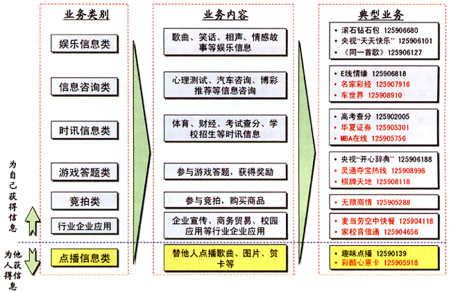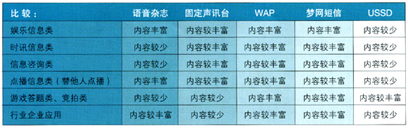 - 時訊信息類和信息咨詢類業(yè)務(wù),IVR優(yōu)勢較強(qiáng),但業(yè)務(wù)范圍較窄,內(nèi)容較少,收入貢獻(xiàn)較低,同時部分業(yè)務(wù)容易受到SP信息源的制約。如果能進(jìn)一步完善服務(wù),滿足用戶需求,業(yè)務(wù)將迅速發(fā)展,應(yīng)該定位于IVR短期發(fā)展的重點(diǎn)業(yè)務(wù)。