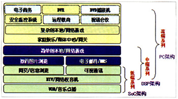 當前國內(nèi)IPTV業(yè)務試點中采用的機頂盒,包括華為、中興、UT等主流廠商都主要采用了基于DSP架構(gòu)的技術(shù)解決方案,除能滿足點播、直播等標清業(yè)務需求外,還可通過軟件升級,以支持信息瀏覽、簡單的本地/網(wǎng)絡游戲等增值業(yè)務,基本上可滿足上述業(yè)務一定規(guī)模用戶商用要求。