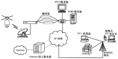 。。WiMAX網(wǎng)絡(luò)支持豐富多彩的業(yè)務(wù)模式。不同速率的數(shù)據(jù)業(yè)務(wù)是網(wǎng)絡(luò)的主要承載目標(biāo)。WiMAX支持不同的QoS級別,因此網(wǎng)絡(luò)覆蓋范圍與業(yè)務(wù)類型緊密相關(guān)。在IPTV的接入方面,由于IPTV需要高級別的QoS保證以及高速的數(shù)據(jù)傳輸速率,所以根據(jù)小區(qū)內(nèi)用戶的數(shù)量以及需求,合理設(shè)置WiMAX網(wǎng)絡(luò)。用戶接入IPTV網(wǎng)絡(luò)的時候。不需要再次進(jìn)行布線,只需加裝WiMAX接收設(shè)備和IP機(jī)頂盒即可,因此用戶可以方便、快捷地使用IPTV業(yè)務(wù)。WiMAX實(shí)現(xiàn)IPTV的接入如圖1所示。