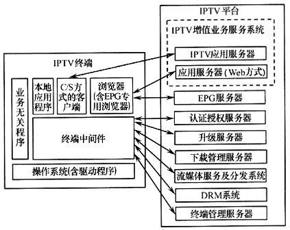 IPTV中間件是當(dāng)前IPTV業(yè)界關(guān)注的熱點之一。業(yè)界對于中間件沒有確切的定義,一般認(rèn)為:中間件是實現(xiàn)異構(gòu)軟件實體間互連互通的一類軟件,則IPTV中間件就是實現(xiàn)IPTV系統(tǒng)中各個節(jié)點之間互連互通的一類軟件。IPTV系統(tǒng)中的節(jié)點類型眾多,包括終端、EPG(電子節(jié)目指南)服務(wù)器、內(nèi)容分發(fā)系統(tǒng)、業(yè)務(wù)管理系統(tǒng)、網(wǎng)管監(jiān)控系統(tǒng)、DRM(數(shù)字版權(quán)管理)、內(nèi)容管理系統(tǒng)、頭端系統(tǒng)等,除終端外,其他節(jié)點都可以統(tǒng)稱為平臺側(cè),因此IPTV中間件也可以分為平臺中間件和終端中間件兩類。平臺中間件實現(xiàn)系統(tǒng)平臺中各個應(yīng)用服務(wù)器之間的互連互通,終端中間件實現(xiàn)IPTV終端和系統(tǒng)平臺之間的互連互通。
