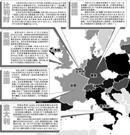 對(duì)于歐洲觀眾來說,IPTV(網(wǎng)絡(luò)付費(fèi)電視)就是他們未來的生活主畫面之一。他們只需每月交付30歐元(約合人民幣309元)到60歐元(約合人民幣618元)的費(fèi)用,便可在電視或電腦上選擇收看上百個(gè)頻道的電視節(jié)目。歐洲雖然缺乏強(qiáng)大的衛(wèi)星網(wǎng)絡(luò)作為技術(shù)支持,不過卻擁有多家實(shí)力雄厚的電信營運(yùn)商,這些巨頭們擁有相同的興趣和市場,正考慮是否聯(lián)合經(jīng)營,共同分食歐洲網(wǎng)絡(luò)電話電視市場這塊“大蛋糕”。