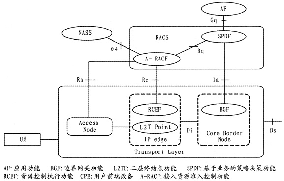RACS是NGN的組成部分之一,將業(yè)務層的資源需求與網(wǎng)絡承載層的資源分配相關(guān)聯(lián),主要完成策略控制、資源預留、接納控制、網(wǎng)絡地址轉(zhuǎn)換(NAT)和防火墻穿越等功能。RACS通過一系列策略為應用提供基于傳輸?shù)目刂品⻊眨灰搼弥С諶ACS接口,RACS就能保證任意應用能夠請求到與其服務相匹配的傳輸資源。同時,RACS為運營商提供多種不同接納控制的方法,并設置各自的承載服務策略。RACS為各種服務提供獲得網(wǎng)絡資源的方法,使得用戶終端可以獲得所提供服務,其總體功能結(jié)構(gòu)如圖3所示[5]。