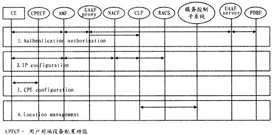 AMF負責翻譯UE的接入請求,將UE的IP地址分配請求以及網(wǎng)絡配置參數(shù)請求轉(zhuǎn)發(fā)至NACF,將用戶鑒權(quán)請求轉(zhuǎn)發(fā)給用戶接入鑒權(quán)功能(UAAF),反向則將來自NACF或UAAF的響應轉(zhuǎn)發(fā)給UE。