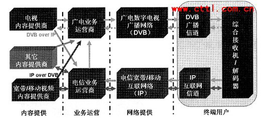 從圖2中我們可以看出,IPTV實際上有電信和廣電兩條業(yè)務(wù)通道。其中,電信的業(yè)務(wù)通道是雙向的通道,而廣電的業(yè)務(wù)通道是單向的,電視內(nèi)容提供商可以利用DVBoverIP技術(shù)通過電信業(yè)務(wù)運營商來開展IPTV業(yè)務(wù)。寬帶/移動視頻內(nèi)容提供商也可以利用IPover