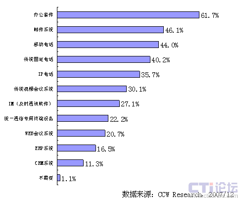 盡管統(tǒng)一通信的概念已經(jīng)被各大廠商廣為宣傳,統(tǒng)一通信的目標是實現(xiàn)各種溝通方式的融合,但是從國內(nèi)的企業(yè)來看,他們對統(tǒng)一通信的認識仍然還處于比較模糊的階段,那么從用戶本身來講,他們最需要統(tǒng)一通信能把哪些功能實現(xiàn)相互融合呢?2007年底,國內(nèi)ICT市場研究咨詢機構(gòu)計世資訊(CCW Research)對國內(nèi)的潛在用戶進行了一次大樣本調(diào)研,被調(diào)研的企業(yè)數(shù)量超過800家,企業(yè)領域分布在各行各業(yè),重點以大中型企業(yè)為主,調(diào)研結(jié)果表明,目前國內(nèi)企業(yè)用戶希望能實現(xiàn)互聯(lián)互通功能排在第一位的是辦公套件、占到所有被調(diào)研對象的六成以上,其次是郵件系統(tǒng)和移動電話,占近一半的比例,之后是固話、視頻會議和即時通信,而和用戶業(yè)務系統(tǒng)的整合,如ERP、CRM則排在最后。CTI論壇編輯