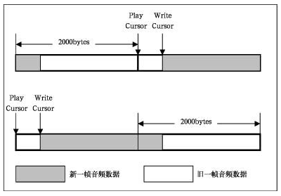 在程序中,設(shè)置一個(gè)大小為一幀音頻數(shù)據(jù)的大小(一般相當(dāng)于0.25秒的語(yǔ)音)的2倍的Streaming Buffer。并且在Streaming Buffer的正中間和結(jié)尾處分別設(shè)置標(biāo)志一個(gè)觸發(fā)事件。程序開(kāi)始時(shí),通過(guò)調(diào)用Play函數(shù)對(duì)Streaming Buffer中的數(shù)據(jù)進(jìn)行循環(huán)回放。當(dāng)Play Cursor到達(dá)正中間和結(jié)尾時(shí),事件就會(huì)產(chǎn)生,就可以通過(guò)程序向緩沖區(qū)寫(xiě)入新一幀的音頻數(shù)據(jù)。在寫(xiě)入新一幀音頻數(shù)據(jù)的過(guò)程中,首先調(diào)用Lock函數(shù)鎖定緩沖區(qū)中的部分,此時(shí)的Write Cursor被鎖定不再前移,而Play Cursor將跟隨著聲音的回放繼續(xù)前進(jìn);利用回放Play Cursor和Write Cursor間的音頻數(shù)據(jù)的一段時(shí)間內(nèi),根據(jù)鎖定時(shí)獲得的lplpvAudioPtr1(此時(shí)的lplpvAudioPtr1指向的地方就是鎖定時(shí)Write Cursor的所指的地方),lpdwAudioBytes1(可安全寫(xiě)入的音頻數(shù)據(jù)大小)等與Streaming Buffer相關(guān)的參數(shù)lplpvAudioPtr2、lpdwAudioBytes2等信息,把數(shù)據(jù)在指定的地方寫(xiě)入緩沖區(qū),然后調(diào)用Unlock函數(shù)解除對(duì)Write Cursor的鎖定。這樣,Write Cursor重新調(diào)整回與Play Cursor保持100~200字節(jié)間距的地方,繼續(xù)對(duì)新的音頻數(shù)據(jù)進(jìn)行回放。上述這個(gè)過(guò)程在整個(gè)程序的運(yùn)行過(guò)程中,不斷地循環(huán)進(jìn)行,如圖1所示,實(shí)現(xiàn)了在對(duì)Streaming Buffer中舊一幀音頻數(shù)據(jù)進(jìn)行回放的同時(shí)寫(xiě)入新一幀的音頻數(shù)據(jù)。