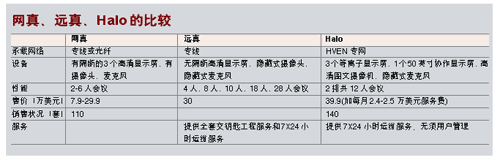 惠普的Halo工作室系統(tǒng)強(qiáng)調(diào)可用于企業(yè)遠(yuǎn)程模擬面對(duì)面業(yè)務(wù)會(huì)議。通過(guò)Halo連接,每個(gè)Halo工作室可支持會(huì)議桌前排六人,第二排三至六人,最多12人的會(huì)議規(guī)模。每個(gè)工作室有三臺(tái)等離子顯示器,參會(huì)人員能夠看到與本人同樣大小的圖像。另外,參會(huì)者還可使用一個(gè)安裝在等離子顯示器上方的50英寸的協(xié)作屏幕,與其他Halo工作室中的人員共享其筆記本電腦中的文件與數(shù)據(jù)。工作室還包括一個(gè)高清圖文攝像機(jī),可用于拍攝桌上的物品并顯示在協(xié)作顯示器上,真實(shí)呈現(xiàn)色彩、陰影與細(xì)微之處。同時(shí)配備的電話讓與會(huì)者可以與Halo工作室外的人員聯(lián)系。工作室配備了廣播質(zhì)量的音頻與照明設(shè)施,參會(huì)者可以使用屏幕上簡(jiǎn)便的用戶界面,通過(guò)點(diǎn)擊鼠標(biāo)開(kāi)始協(xié)作。一個(gè)復(fù)雜的軟件控制系統(tǒng)將確保各個(gè)Halo工作室輕松、無(wú)縫地協(xié)同工作。