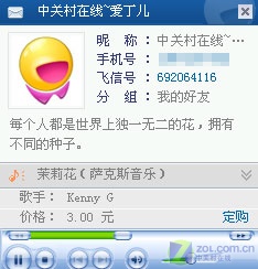 你可以點(diǎn)擊藍(lán)色文字鏈接,在彈出的窗口中單擊左下角的“播放/暫停”按鈕,以實(shí)現(xiàn)在PC機(jī)上聽好友彩鈴(如圖5)!這樣的功能其它IM軟件好像沒有,唯飛信才有的獨(dú)家功能!