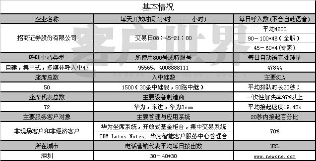 招商證券客服中心成立于2000年,是招商證券在國內證券業(yè)首家推出的多媒體客戶服務中心,是一個全國性、集中式、智能化、面向全公司客戶的綜合性客戶服務中心,一貫秉承公司“誠信、穩(wěn)健、服務、創(chuàng)新”的經營理念,全面實現(xiàn)“理財中心、咨訴中心、信息中心、監(jiān)控中心、”的功能目標。