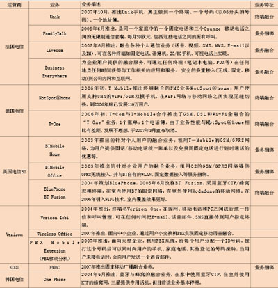 從全球范圍來看,大多數(shù)重要的固定運營商、移動運營商和綜合性運營商都已經(jīng)開始或計劃提供各種形式FMC業(yè)務(見表)。其中大多數(shù)運營商提供捆綁業(yè)務和簡單的融合業(yè)務,而歐美的一些頂尖運營商已推出基于融合終端的FMC業(yè)務。