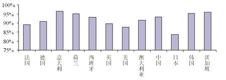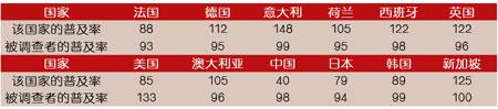 Ovum咨詢公司最近對全球12個國家的移動用戶在移動業(yè)務方面的使用特性進行了調(diào)查。這12個國家包括法國、德國、意大利、荷蘭、西班牙、英國、美國、澳大利亞、中國、日本、韓國、新加坡等。根據(jù)調(diào)查結(jié)果,Ovum認為,盡管現(xiàn)有的移動應用非常豐富,但是用戶對于很多新業(yè)務的認知和使用程度并不高,移動運營商下一步需要解決資費昂貴、使用不方便等方面的問題。表1 移動電話普及率情況(%)