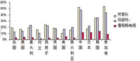 除打電話、發(fā)短信、拍照、手機郵箱以外,音樂、游戲也是用戶每周使用較多的業(yè)務。當被問及其它應用時,來自中國、新加坡還有韓國的部分被調(diào)查者表示,他們會經(jīng)常用手機來聽音樂和玩游戲。其中,中國是惟一一個選擇用手機聽音樂的用戶數(shù)與選擇用手機拍照的用戶數(shù)旗鼓相當?shù)膰摇5腥さ氖牵謾C在中國不太可能成為MP3的替代品,仍然只是一個便攜播放器。在新加坡,手機替代MP3的可能性就大多了。Ovum認為,這是由于高端手機在新加坡市場占有很高的比例。在歐洲和美國,使用手機來聽音樂和玩游戲的比例則比亞洲少了很多,但值得鼓勵的是仍有超過10%的被調(diào)查者選擇了該答案。(見圖2)