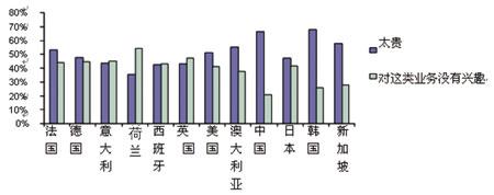 除了每周使用量之外,Ovum還向被調(diào)查者詢問是什么因素阻礙了他們通過手機應用上述程序,被提及的最大顧慮是價格昂貴,其次是沒有興趣。在歐洲一些國家,對業(yè)務不感興趣是和費用昂貴同等重要的原因,在荷蘭,選擇對移動業(yè)務不感興趣的比例甚至超過了認為費用昂貴的比例。此外很有趣的是,沒有一個被調(diào)查者表示因為手機沒有這些功能而導致無法使用業(yè)務。(見圖4)