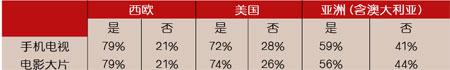 在被問及每月愿意花多少錢來收看手機電視和電影大片時,歐洲和美國的被調(diào)查者表示出非常低的支付意愿。在歐洲,79%的被調(diào)查者不愿意為手機電視和電影支付費用,美國的情況更糟糕,澳大利亞的回答則與歐洲的回答非常接近。在亞洲,59%的被調(diào)查者不愿為這些服務支付費用。在日本,72%的被調(diào)查者不愿為手機電視付費,但是對于支付手機電影大片的反對率下降到了55%。(見表2)