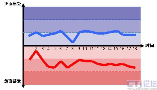 圖2的情感曲線分別是中國(guó)移動(dòng)的“喜愛(ài)”情感曲線和中國(guó)電信的“討厭”情感曲線,對(duì)應(yīng)于雙方整個(gè)呼入電話體驗(yàn)18個(gè)子流程上的情感感受。(注意,我們只列出了中國(guó)移動(dòng)的“喜愛(ài)”曲線和中國(guó)電信的“討厭”曲線來(lái)舉例說(shuō)明。)