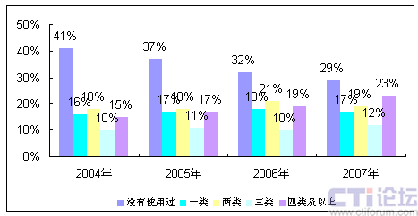 圖1 2004-2007年用戶使用智能手機使用的移動互聯(lián)網(wǎng)種類