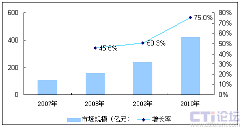 圖2 2008-2010年中國移動互聯(lián)網(wǎng)市場規(guī)模預測