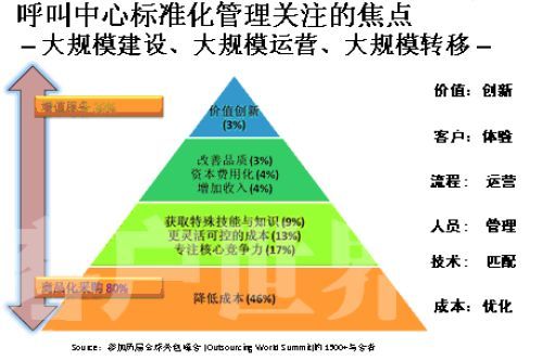那么,對于這個尚處在”嬰兒潮”時期的產(chǎn)業(yè),我們最應(yīng)該做些什么來呵護和培育這個產(chǎn)業(yè)健康有序的發(fā)展?大家要好好呵護這個行業(yè)。如果只是強調(diào)“要想讓呼叫中心發(fā)展,那就需要我們多投錢,這樣就能買許多機器,放在公司里面。規(guī)格有了,那呼叫中心就發(fā)展了。”我覺得這樣的說法是對呼叫中心發(fā)展的錯誤理解。我們這個標(biāo)準(zhǔn)是希望營建專業(yè)化的產(chǎn)業(yè),整個呼叫中心產(chǎn)業(yè)的價值金字塔,這個金字塔每年在美國有一個專場,就叫呼叫中心專場,標(biāo)志一個產(chǎn)業(yè)成熟的金字塔是怎樣的。通過調(diào)查發(fā)現(xiàn),當(dāng)產(chǎn)業(yè)進入成熟階段,標(biāo)準(zhǔn)化服務(wù)的第一個就是降低成本,也就是提高生產(chǎn)效益,能夠把這個產(chǎn)業(yè)細化分解,高度的模塊化進行精細控制的時候,其他的差異化的體現(xiàn)。呼叫中心本身是不是成為企業(yè)核心競爭力的一部分,或者說越來越成熟的外包商出現(xiàn),能夠把一些企業(yè)非核心競爭力加入到自己的核心競爭力之上,這叫專業(yè)化。還有一個更加靈活可控的成本,呼叫中心的彈性從一百人到一千人,一千人到三千人的發(fā)展更加可控。還有獲得特殊技能與知識,事實上呼叫中心各行各業(yè)知識都會接觸,你只有專著才能做得更好,本身對于呼叫中心的從業(yè)人員來說,在這個產(chǎn)業(yè)中扮演的角色不是締造一個企業(yè)的核心競爭力,怎么期望從業(yè)人員掌握更多的技能和知識,來指導(dǎo)更多的行業(yè)和企業(yè)。特別是在客戶導(dǎo)向上面的發(fā)展,還有在金字塔上面增加收入,分析客戶所需,讓我們更好的滿足客戶的需求;然后資本費用化,從外包專業(yè)化領(lǐng)域帶來的變化,很多的時候最大的一筆建設(shè)是呼叫中心,基本一個中等的呼叫中心沒有500萬以上的資金投入是不可想象的。