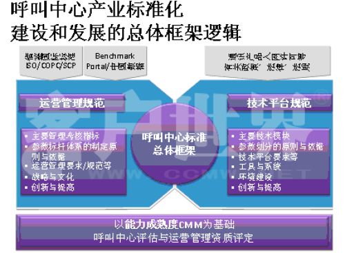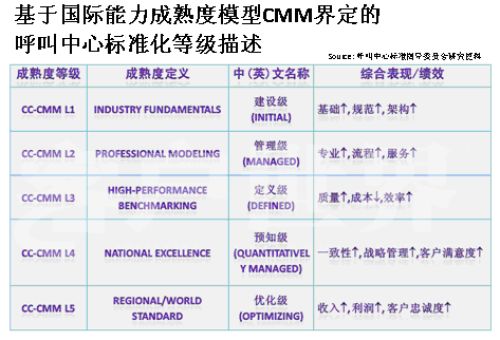 Markets)呼叫中心產(chǎn)業(yè)深入研究相結(jié)合的成果。。我在前幾年企業(yè)實施標(biāo)準(zhǔn)的時候深入研究了這套模型,這套模型對我們呼叫中心產(chǎn)業(yè)有極大的適用性,幾乎每個呼叫中心都可以在這套模型找到定位,從一個渾沌的初始過程到管理者,如果能夠建設(shè)一個持續(xù)的管控的流程到定義級,如何進行一致化管理,再到預(yù)知級,幾乎每個呼叫中心從大到小,從年輕到發(fā)展一段時間都可以找到自己的定位,所以我們在原來的信息產(chǎn)業(yè)指導(dǎo)委員會的支持下,我們重新結(jié)合CMM模型開發(fā)出了符合我們呼叫中心發(fā)展的一個標(biāo)準(zhǔn),我建議大家把它看成是一個模型,整個國際產(chǎn)業(yè)都定性了標(biāo)準(zhǔn),因為大家都知道CMM模型是一個開放性的知識體系,并不是一個封閉標(biāo)準(zhǔn)。CMM模型,首先你的呼叫中心建設(shè)要能夠符合呼叫中心的定義,不是找?guī)着_話機或?qū)ν庥袀一個客服號碼對外就能稱為呼叫中心。