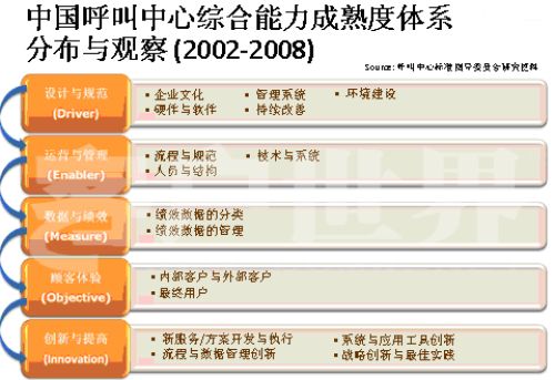 在過去幾年我們也做了很多研究,一個呼叫中心整合持續(xù)建設(shè)在哪些方面應(yīng)該做定義。基本上我們是分為五個方面,在每一級的成熟度方面,我們的呼叫中心都關(guān)注自己的成熟度。1、設(shè)計與規(guī)范;2、運營管理;3、數(shù)據(jù)與績效;4、顧客體驗;5、創(chuàng)新與提高。第五方面創(chuàng)新與提高在CMM模型中是特有的,它在整個產(chǎn)業(yè)的發(fā)展過程中,提供戰(zhàn)略革新和戰(zhàn)略工具一體化使用的指導(dǎo)框架和最佳實踐。