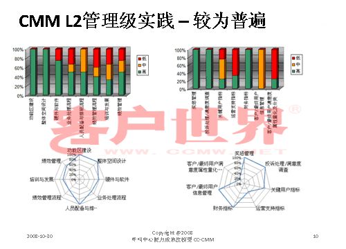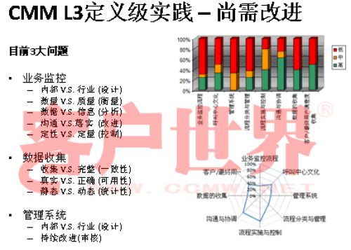 接下來我用一個很小的案例結(jié)束今天的分享,我們整個的呼叫中心的成熟度模型目前是在電信行業(yè)開始了2008年版的推廣,成熟度模型經(jīng)歷從07年成立亞太呼叫中心產(chǎn)業(yè)聯(lián)盟以后,由一群這個行業(yè)里面的專家,特別是中國產(chǎn)業(yè)市場的發(fā)展建立起的標(biāo)準(zhǔn),一年以來在通信行業(yè)我們做的能力成熟度的判定有一些很有意思的啟示,通信行業(yè)占到我們整個呼叫中心產(chǎn)業(yè)約70%的坐席,是最大的、最有代表性的產(chǎn)業(yè)。做下來真的很有代表性,普遍性在于環(huán)境建設(shè)、資產(chǎn)投入、資產(chǎn)配置,所以這下面的雷達就可以看到,相對完善都是在環(huán)境建設(shè),功能區(qū)建設(shè),整體空間設(shè)計、硬件相對來說比較偏硬的一些。在其他方面偏廢的比較厲害。第二個雷達在一些獎懲管理、信息管理,整個軟性方面幾乎有很濃重的一些計劃經(jīng)濟,制造行業(yè)的一些領(lǐng)域相對來說比較成熟。我們目前看到的,基本上通信行業(yè)的一些發(fā)展在能力成熟度上是二級到四級,尤其以二到三級的發(fā)展更為普遍。通常的方法為期一周的標(biāo)桿調(diào)研,看所有的呼叫中心發(fā)展的五個方面,我們才會在里面做這樣的判定。在能力成熟度的三級,我們做了一些企業(yè)發(fā)現(xiàn),特別在三級,關(guān)于能不能對流程進行一致性管理方面,就是剛才李老師講到的不是最急的,而管理是最重要的?赡芩械牧鞒潭喽嗌偕儆幸恍┏墒於鹊膯栴},但是我們的源頭流程能力在三個方面有很大的差距:一個是業(yè)務(wù)監(jiān)控流程,第二個數(shù)據(jù)收集流程,還有一個是管理系統(tǒng)的審核流程。這個大家可以和自己的呼叫中心比一比。