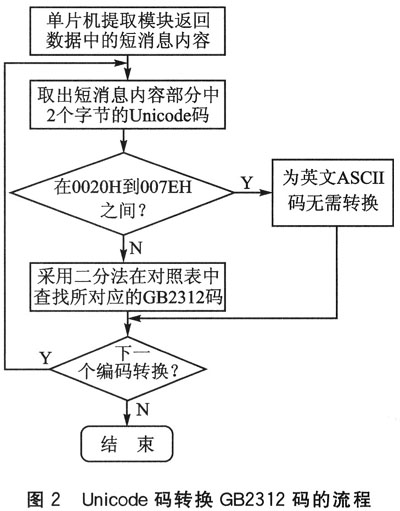 單片機(jī)通過串口與模塊連接后,發(fā)送讀取第一條新短消息指令:“AT+CMGR=1”。提取模塊接收的短消息后,先判斷其內(nèi)容是否為ASCII碼。若為ASCII碼,則無需轉(zhuǎn)換直接讀;否則,通過查表法查找其對應(yīng)的漢字GB碼,實(shí)現(xiàn)不同編碼間的轉(zhuǎn)換。轉(zhuǎn)換流程如圖2所示。