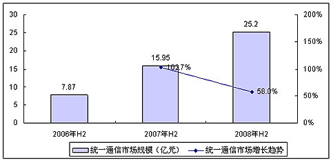 賽迪顧問(wèn)數(shù)據(jù)顯示,2008年下半年,中國(guó)統(tǒng)一通信市場(chǎng)繼續(xù)延續(xù)了上半年的快速增長(zhǎng),整體市場(chǎng)規(guī)模超過(guò)了25.2億,同比增長(zhǎng)58%,超過(guò)2007年全年市場(chǎng)規(guī)模。
