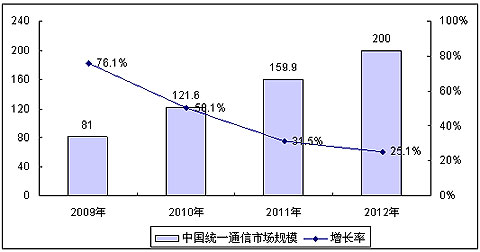 賽迪顧問(wèn)預(yù)測(cè),伴隨著全球經(jīng)濟(jì)的逐漸復(fù)蘇和企業(yè)對(duì)統(tǒng)一通信產(chǎn)品認(rèn)識(shí)與需求的持續(xù)增長(zhǎng),2009年中國(guó)統(tǒng)一通信市場(chǎng)將出現(xiàn)加速增長(zhǎng)的趨勢(shì),全年市場(chǎng)規(guī)模將達(dá)81億元,同比增長(zhǎng)76.1%,至2012年,中國(guó)統(tǒng)一通信整體市場(chǎng)規(guī)模將達(dá)200億元,平均年增長(zhǎng)率超過(guò)30%。