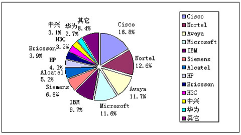 賽迪顧問(wèn)數(shù)據(jù)顯示,通信設(shè)備市場(chǎng)繼續(xù)占據(jù)最大的市場(chǎng)比重,2008年下半年,統(tǒng)一通信設(shè)備市場(chǎng)占整個(gè)市場(chǎng)份額的比例為63.9%,這主要是由于目前的中國(guó)統(tǒng)一通信市場(chǎng)還處于成長(zhǎng)階段,主要市場(chǎng)份額仍然由Cisco、Nortel、Avaya等知名電信設(shè)備廠(chǎng)商占據(jù)。近年來(lái),Microsoft、IBM等世界頂尖級(jí)的軟件廠(chǎng)商在統(tǒng)一通信市場(chǎng)表現(xiàn)不俗,市場(chǎng)發(fā)展趨勢(shì)顯示,隨著技術(shù)的不斷成熟和應(yīng)用的不斷發(fā)展,統(tǒng)一通信軟件市場(chǎng)份額還將進(jìn)一步的增加。