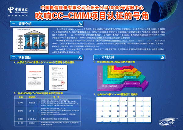 在為期四天(2009.1.13—2009.1.16)的最終評審中,專家們采用現(xiàn)場觀察、員工座談、文件審閱等多種形式對臺州電信10000號客服中心的運營現(xiàn)狀進行全方位考評,高度評價了客服中心在短短三個月中取得的進步。最終,認證專家一致通過授予臺州電信10000號呼叫中心能力成熟度模型CC-CMM應用級認證。