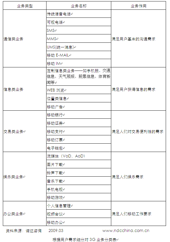 從個(gè)體用戶橫向需求角度對(duì)業(yè)務(wù)進(jìn)行劃分,3G業(yè)務(wù)可以分為五大類,主要包括五類通訊類業(yè)務(wù)、信息類業(yè)務(wù)、交易類業(yè)務(wù)、娛樂(lè)類業(yè)務(wù)、辦公類業(yè)務(wù)。諾達(dá)咨詢《3G發(fā)展報(bào)告系列——全球3G業(yè)務(wù)與運(yùn)營(yíng)市場(chǎng)發(fā)展研究報(bào)告2009》認(rèn)為該種一方面考慮了企業(yè)業(yè)務(wù)發(fā)展相近性和規(guī)模效應(yīng),另一方面考慮的用戶的不同需求特性,把一個(gè)用戶多種需求分割開(kāi)來(lái),以實(shí)現(xiàn)低成本的使需求得以滿足。是一種傳統(tǒng)的業(yè)務(wù)分類方法,適合傳統(tǒng)技術(shù)條件下的合作分工的市場(chǎng)及產(chǎn)業(yè)環(huán)境。這種分類方法利于業(yè)務(wù)的設(shè)計(jì)及推出。