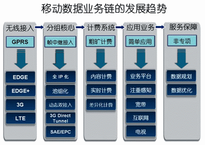 回顧現(xiàn)代通信走過(guò)的歷程,當(dāng)數(shù)字通信技術(shù)出現(xiàn)的時(shí)候,通信普及成本大幅度下降,于是更多的人得以享受電話通信的便利,人類(lèi)也由此進(jìn)入了數(shù)字通信時(shí)代;移動(dòng)電話的出現(xiàn)和普及,使人們可以隨時(shí)隨地進(jìn)行溝通,引領(lǐng)我們步入移動(dòng)通信時(shí)代;基于IP技術(shù)的互聯(lián)網(wǎng)的興起,進(jìn)一步拓展了人類(lèi)通信的廣闊空間,創(chuàng)造了新的通信手段,使我們步入了互聯(lián)網(wǎng)通信時(shí)代;寬帶技術(shù)的成熟和廣泛部署,賦予了基于包交換的通信方式更強(qiáng)的數(shù)據(jù)傳送能力,開(kāi)創(chuàng)了人類(lèi)的數(shù)據(jù)通信時(shí)代。圖1 移動(dòng)數(shù)據(jù)業(yè)務(wù)鏈的發(fā)展趨勢(shì)