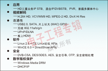 標(biāo)清(SD)對(duì)于大眾市場(chǎng)來(lái)說(shuō)是一個(gè)合乎邏輯的選擇。ODM廠商不管選用哪種操作系統(tǒng)(Windows CE或Linux)都能與NXP公司的IP-STB平臺(tái)相結(jié)合,為本地市場(chǎng)生產(chǎn)所期望的產(chǎn)品。