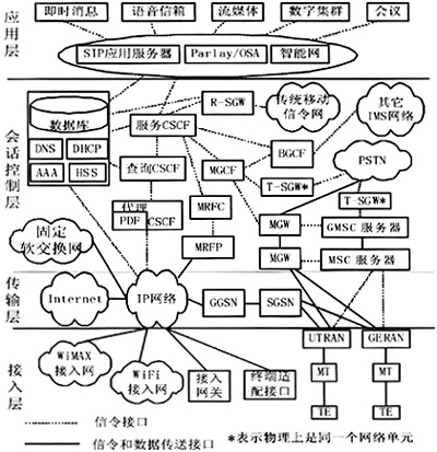 應(yīng)用層包括SIP應(yīng)用服務(wù)器、Parlay/OSA和智能網(wǎng)。Parlay/OSA提供的標(biāo)準(zhǔn)應(yīng)用編程接口(API),提供了一個(gè)開放的業(yè)務(wù)平臺(tái),有利于第三方的業(yè)務(wù)提供。具體的業(yè)務(wù),如語音、視頻、即時(shí)消息、數(shù)字集群等都可以融合在統(tǒng)一的平臺(tái)上。