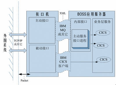 由圖1可知,從調用方向的角度看,接口可分為主動接口和被動接口,分別表示BOSS調用外圍系統(tǒng)服務,以及外圍系統(tǒng)調用BOSS服務。主動接口由BOSS應用服務器驅動,即BOSS應用服務器上的主動服務接口進程,是調用CICS對相關待處理表進行輪詢,并將每一條記錄封裝為一條消息放入MQ隊列(該隊列均由消息組成),接口機上的主動接口再從隊列中取出消息進行解析,進而根據(jù)控制信息發(fā)送到指定系統(tǒng)執(zhí)行。被動接口則是由外圍系統(tǒng)驅動,通過接口機上的CICS客戶端調用BOSS應用服務器上的業(yè)務層服務操作數(shù)據(jù)庫。
