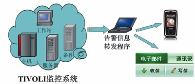 在具體實施上,為了形成統(tǒng)一的體系以方便監(jiān)控并達到告警信息與實時的反饋,可將以上4個層面因素納入IBM公司開發(fā)的TIVOLI監(jiān)控系統(tǒng)。除此之外,為實現(xiàn)告警信息的自動推送與分發(fā),可將自行開發(fā)告警信息轉發(fā)程序接入TIVOLI監(jiān)控系統(tǒng)信息庫。一旦檢測到異常信息存在則立即進行短信或郵件的發(fā)送,確保維護人員及時了解接口系統(tǒng)運行情況。整個過程如圖2所示。