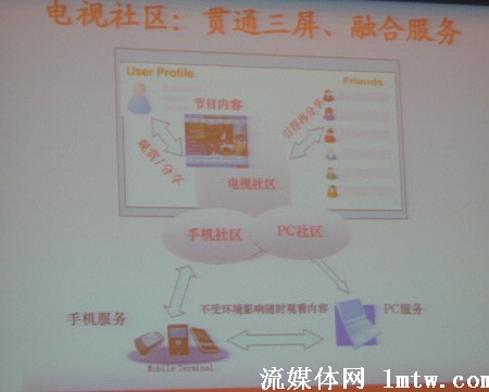 百視通在數(shù)月前便發(fā)布了三屏融合戰(zhàn)略,據(jù)李川介紹,百視通是從節(jié)目分享開始著手的。比如發(fā)一個(gè)片花到手機(jī)上,用戶喜歡的話可以定制,IPTV上設(shè)一個(gè)入口,兩相對(duì)接,用戶點(diǎn)一兩個(gè)鍵就可以很方便的看到他需要的視頻,從而解決了不斷翻頁造成用戶流失的問題。而在電腦上,也可以實(shí)現(xiàn)這樣的定制,甚至是異地傳送。亦即即使出差在外地,也可以很簡單的通過互聯(lián)網(wǎng)定制IPTV節(jié)目送給家人、朋友。