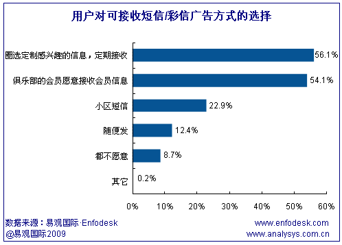 從用戶對短信廣告的接受程度來看,用戶對于自己感興趣領(lǐng)域的短信廣告并不反感,甚至樂于接受或定制。根據(jù)易觀國際Enfodesk發(fā)布的用戶調(diào)研數(shù)據(jù),56.1%的用戶愿意定制自己感興趣的信息,54.1%的用戶愿意接受會(huì)員信息,只有8.7%的用戶不愿意接受任何形式的短信/彩信廣告。但是這類用戶樂于接受的短信廣告反而一般有固定的端口號,更容易被攔截,因此易觀國際(Analysys