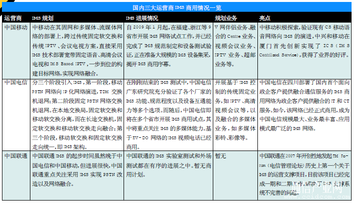 國(guó)內(nèi)三大運(yùn)營(yíng)商已經(jīng)開(kāi)始積極試點(diǎn)和部署IMS商用網(wǎng)絡(luò),樹(shù)立全業(yè)務(wù)競(jìng)爭(zhēng)市場(chǎng)的優(yōu)勢(shì)。