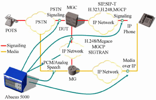 例如,運營商在部署VoIP網(wǎng)絡(luò)時,有可能會采用A廠家的軟交換和B廠家的接入網(wǎng)關(guān)設(shè)備,如何確認(rèn)這兩家的設(shè)備在一起互通時沒有性能上的問題?這時可以采用儀表仿真接入網(wǎng)關(guān)下面的模擬線終端,往網(wǎng)關(guān)和軟交換側(cè)發(fā)起呼叫,再由軟交換將呼叫路由回網(wǎng)關(guān)再到終端。通過這種方式,由儀表發(fā)起成千上萬的呼叫經(jīng)過接入網(wǎng)關(guān)和軟交換,可以有效地驗證這兩種設(shè)備在互通的時候有沒有性能和穩(wěn)定性問題。