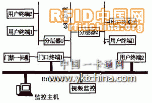 系統(tǒng)采用了兩套獨立的網(wǎng)絡系統(tǒng),第一套是基于485總線半雙工網(wǎng)絡系統(tǒng),第二套是基于以太網(wǎng)的局域網(wǎng);485總線半雙工網(wǎng)絡系統(tǒng)用以連接門口終端、分層器和用戶終端,這主要是從成本上考慮。由于這三部分交換的信息比較少,數(shù)據(jù)交換的速度要求也不是很高而且實現(xiàn)比較簡單,故采用了這種網(wǎng)絡系統(tǒng)。