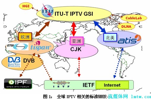 當前,全球范圍內(nèi)有多個國際和地區(qū)標準化組織都在開展IPTV相關(guān)的標準和技術(shù)規(guī)范制定與推廣工作,主要集中在歐洲、北美和亞洲(中、日、韓,CJK)。各主要組織及其相互關(guān)系如圖1所示。